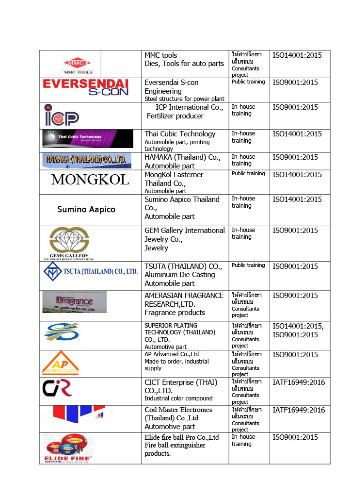 ไทยไอเอสโอ คอนซัลแตนท์ มีการเปิดให้บริการการฝึกอบรมหลายรูปแบบ ให้โอกาสลูกค้าเลือกตามความต้องการ ทั้ง Public training และ In-house training เราทำการดำเนินกิจการโดยอาจารย์ กิตติพนธ์ สมานพงษ์ และทีมที่ปรึกษาหลากหลายอาชีพ ครอบคลุมทั้ง ผลิตภัณฑ์และการบริการ ที่ปรึกษาที่มีความเชี่ยวชาญและประสบการณ์ตรงในสาย Manufacturing (Monozukuri), Quality and Engineering เราพร้อมที่จะมอบความรู้ กระบวนการพัฒนา จากความเชี่ยวชาญของเรา ผ่านการฝึกอบรม และกิจกรรมการดำเนินการต่างๆ ด้วยรูปแบบและเทคนิคที่ใช้งานได้จริง เพื่อช่วยเหลือลูกค้า ให้เข้าใจในความต้องการของข้อกำหนด กฎระเบียบ, พัฒนากระบวนการทางธุรกิจ และตอบสนองความต้องการของลูกค้า และความพึงพอใจสูงสุดของลูกค้า